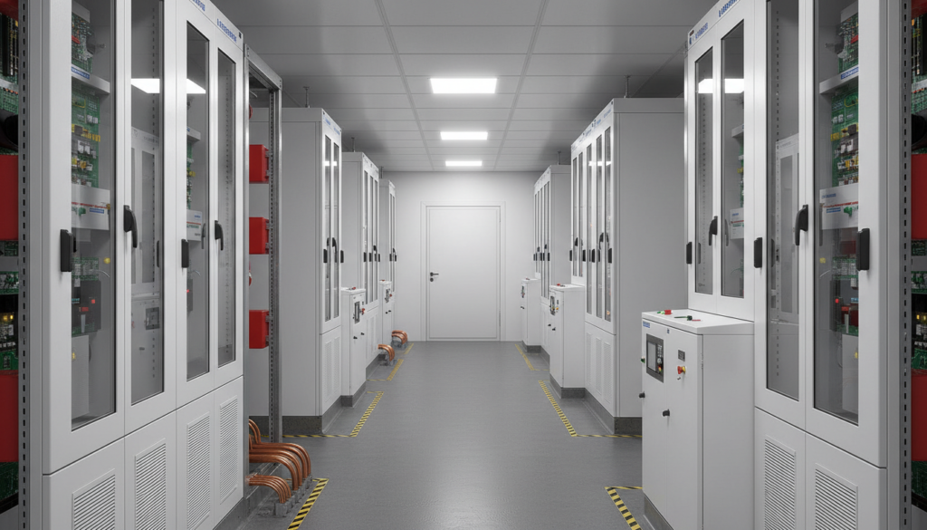 Im Inneren eines E‑House-Umspannwerks befinden sich üblicherweise Mittelspannungsschaltanlagen, Transformatoren, Niederspannungs-Hauptverteilungen, Schutz- und Leittechnik, Eigenbedarfsversorgung, USV-Anlagen sowie häufig auch Kommunikations- und SCADA-Systeme. Die Anordnung folgt einem klaren Layoutkonzept, das auf kurze Kabellängen, eine logische Betriebsmitteltrennung und gute Zugänglichkeit für Bedienung und Wartung ausgelegt ist. Kabelführungen werden in Kabelkanälen oder unterflurigen Trassen gebündelt, sodass spätere Erweiterungen möglichst ohne Eingriffe in die tragende Struktur realisierbar sind.