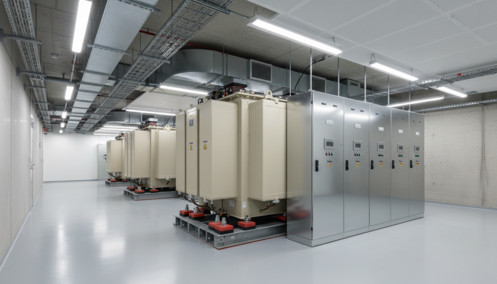 In der Praxis werden Niedrigschall‑Trockentransformatoren meist in kompakten MS/NS‑Stationen mit Mittelspannungs‑Schaltanlage und Niederspannungs‑Hauptverteilung kombiniert. In deutschen Büro- und Gewerbeprojekten befinden sich diese Stationen häufig in Untergeschossen, im Erdgeschoss oder auf Technikgeschossen. Der geringe Geräuschpegel erleichtert diese Integration erheblich: Transformatorräume können näher an Mietflächen rücken, ohne dass dies zwingend zu massiven Schallschutzaufbauten führt.